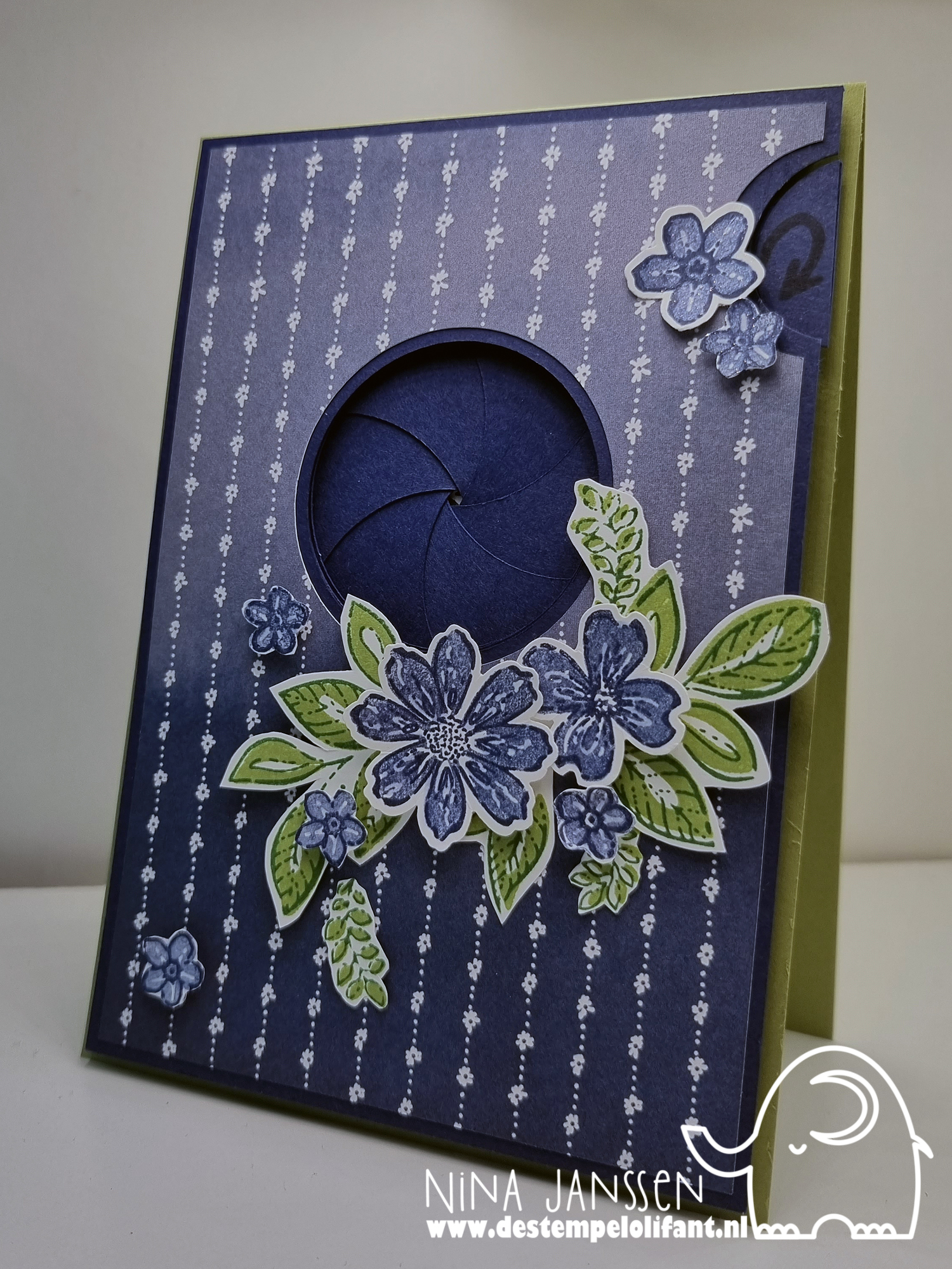 voor de bloemen heb ik Night of Navy gebruikt, waarbij de basis van de bloemen 2e generatie gestempeld is. ( dat wil zeggen, na het beinkten eerst op een kladblaadje stempelen, en de 2e keer direct op het juiste papier. ) Hierdoor krijg je een niets lichtere kleur. Voor de stempel met de lijntjes heb ik dus wel direct gestempeld. Zo heb je toch 2 tinten blauw, terwijl je maar 1 stempelinkt gebruikt hebt. Bij de blaadjes heb ik voor de basis Pear Pizzazz gebruikt, voor de lijntjes de kleur Garden Green.